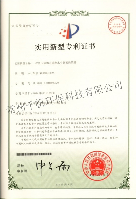 实用新型专利证书 一种负压蒸馏去除废水中氨氮的装置