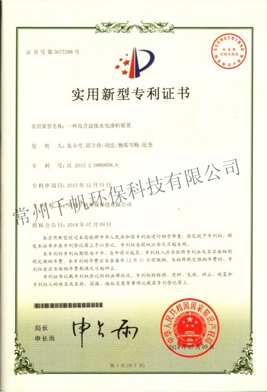 实用新型专利证书 一种负压蒸馏去除废水中氨氮的装置